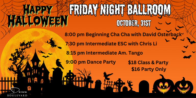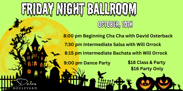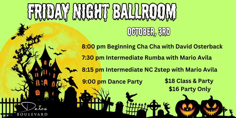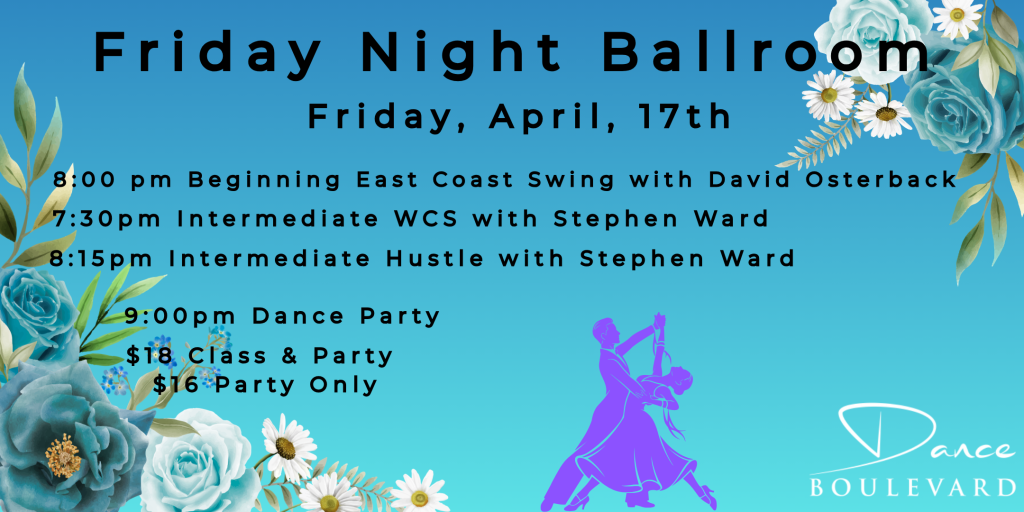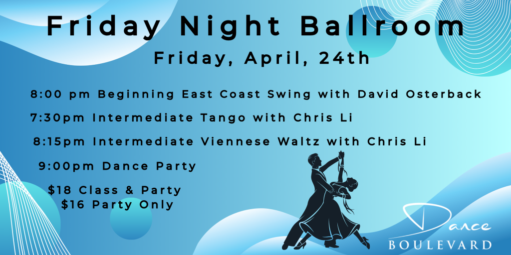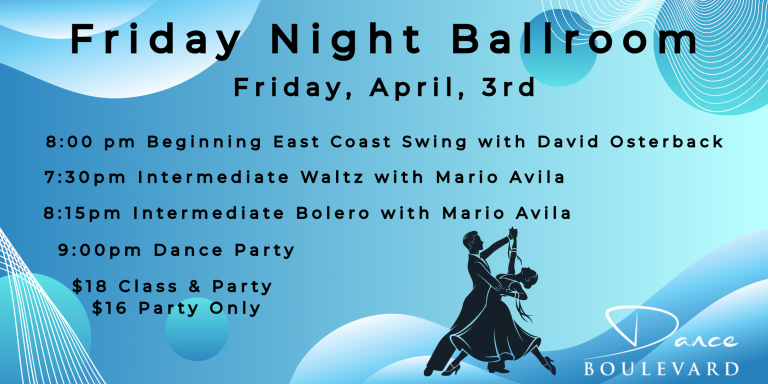 Friday Night Ballroom Dance 8:00 pm Beginning Class Intermediate Classes 7:30 pm & 8:15 pm 9:00 pm Dance Party DJ Dave Ingalz $18 Class & Party $16 Party Only
